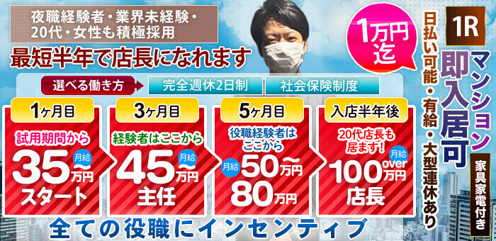 【選べる完全週休2日と無料で即入居可な寮有り】未経験は試用期間から月給35万~、経験者月給45万~スタート!最短半年で店長になれます!夜職経験者、未経験、20代、女性も積極採用!実働9時間、日払・有休