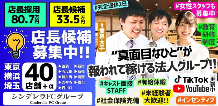 勤務地:▶東京都内 ・新宿・池袋・吉祥寺・五反田・品川・新橋・錦糸町・葛西 ▶埼玉県内 ・西川口 ▶神奈川県内 ・横浜 ※全店舗とも最寄駅から徒歩4分以内です。