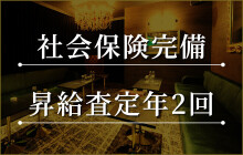 待遇 | ◎即日勤務可 ◎日払い対応有 (社内規定による) ◎社会保険完備 ◎まかない有 ◎寮有 ◎自宅まで車の送り有 (深夜の帰宅サポート) ◎交通費支給 (社内規定による) ◎制服貸与 (ご自身でご用意いただく物あり:ワイシャツ・黒パンツ・革靴) ◎昇給:原則年2回 (業績・評価に応じて) ◎有給休暇有 ◎長期休暇有 (夏季休暇・年末年始休暇) ◎特別休暇有 (慶弔休暇・産前産後休暇・育児休暇・介護休暇) |